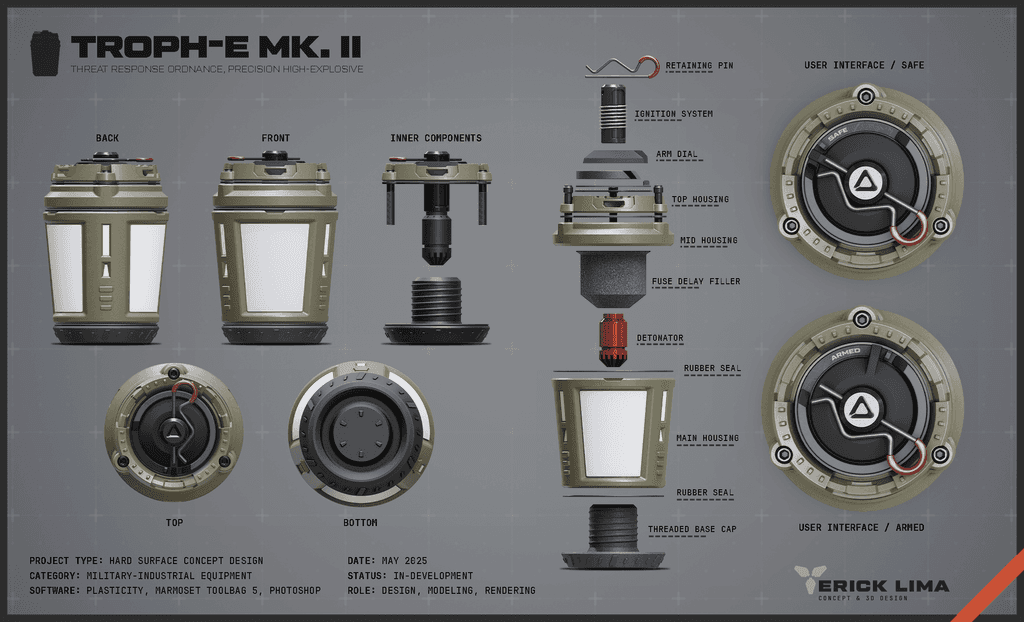 The TROPHE Mk.II and TROPHE-KS project began as a deep dive into refining my hard surface workflow, pushing beyond my original grenade design to deliver production quality assets. My approach was guided by the fundamentals of art and design, rapid iteration, and an emphasis on tactical realism, each stage was carefully documented and refined in collaboration with my mentor, Ivan Santic.